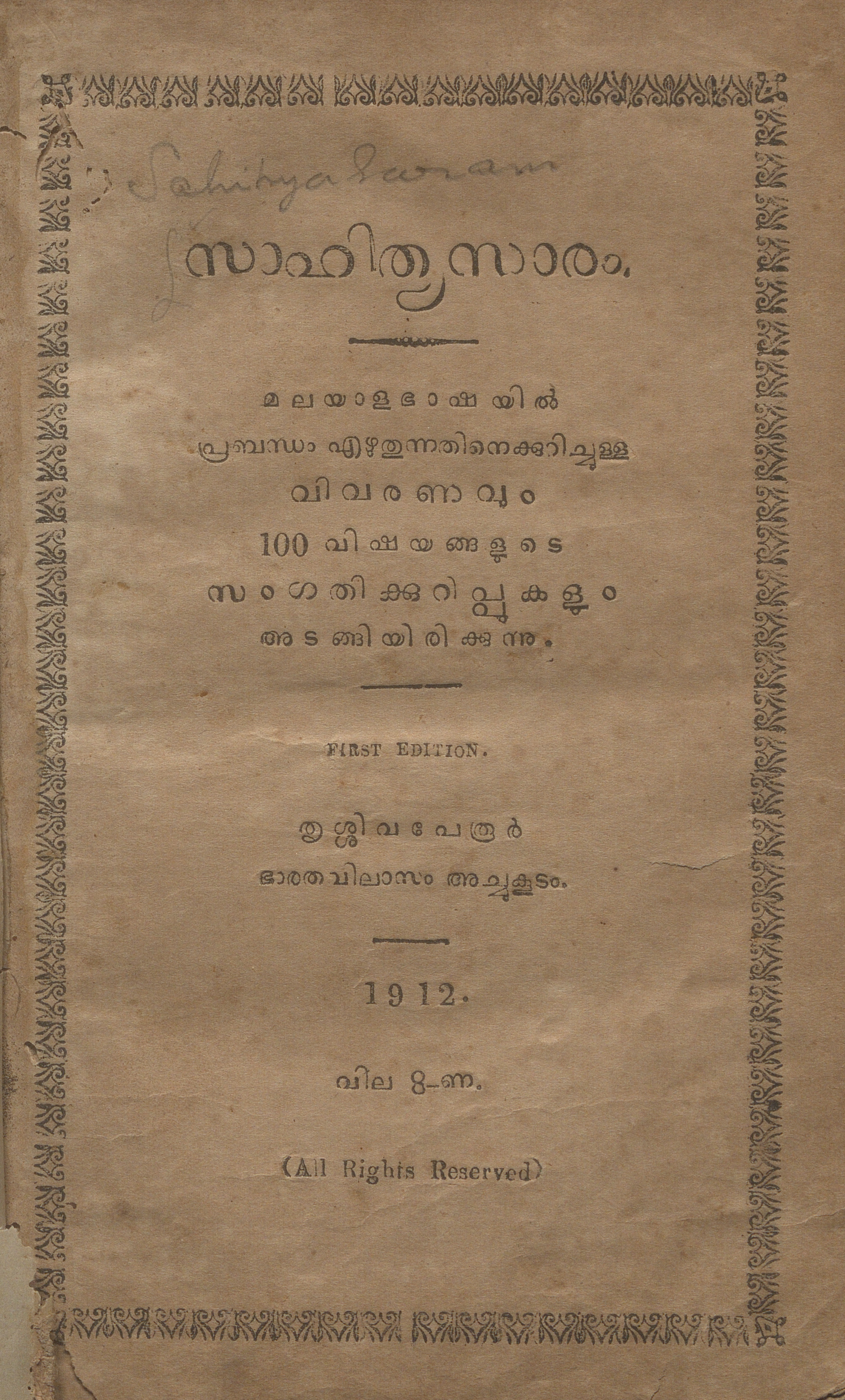 1912-ൽ പ്രസിദ്ധീകരിച്ച, പി. പി രാമയ്യർ എഴുതിയ സാഹിത്യസാരം എന്ന പുസ്തകത്തിൻ്റെ ഡിജിറ്റൽ സ്കാൻ ആണ് ഈ പോസ്റ്റിലൂടെ പങ്കു വെക്കുന്നത്.
