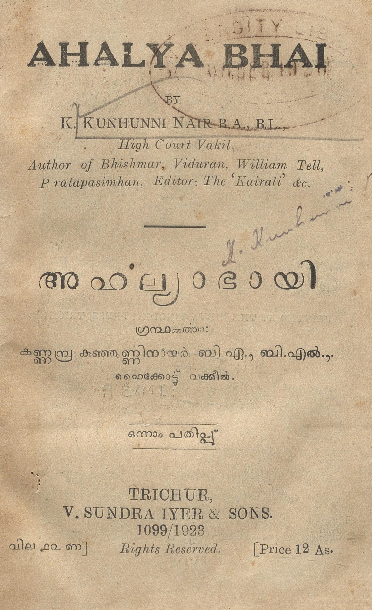 1923-ൽ പ്രസിദ്ധീകരിച്ച, അഹല്യാഭായി എന്ന പുസ്തകത്തിൻ്റെ ഡിജിറ്റൽ സ്കാൻ ആണ് ഈ പോസ്റ്റിലൂടെ പങ്കു വെക്കുന്നത്