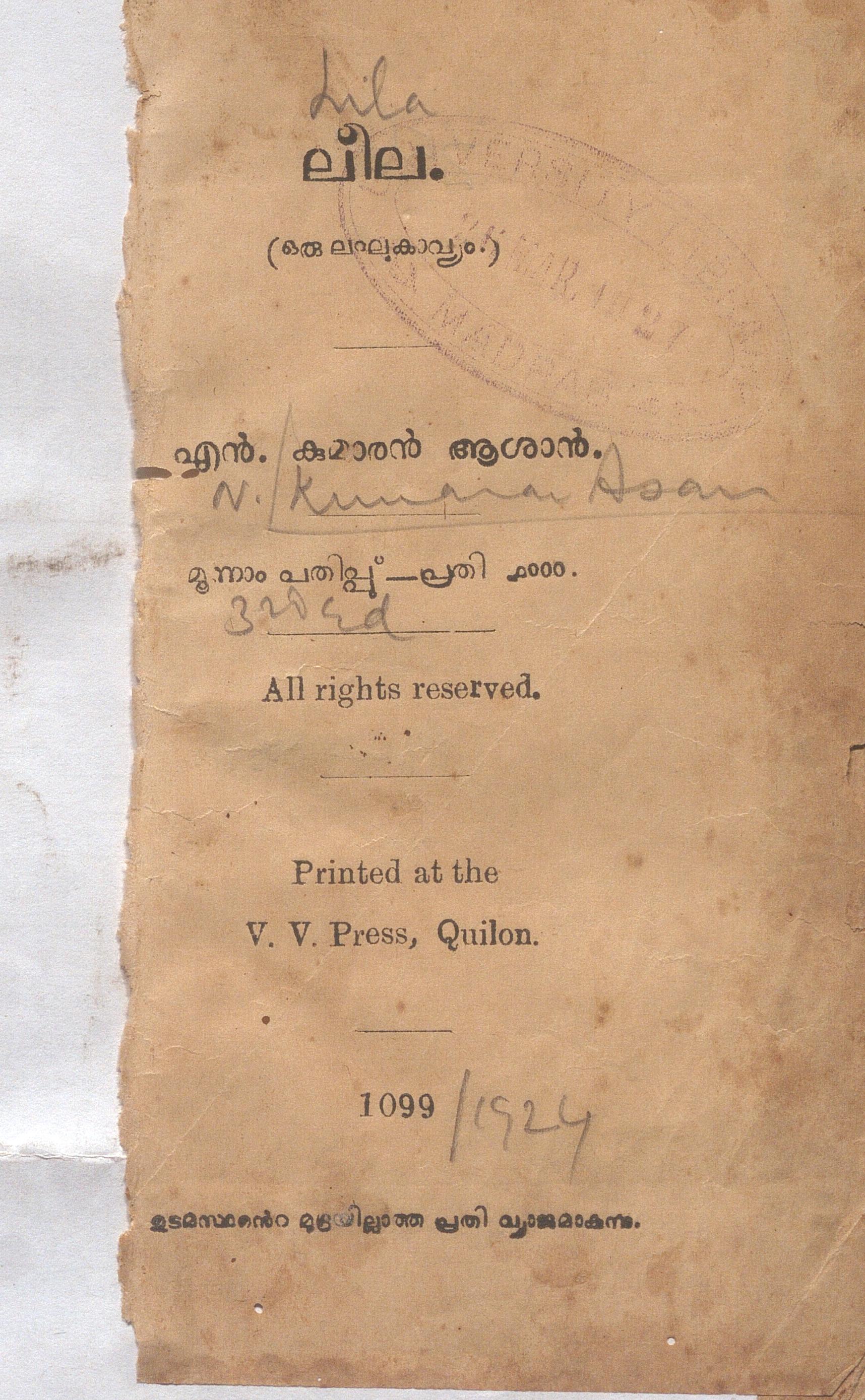 1924-ൽ പ്രസിദ്ധീകരിച്ച, എൻ. കുമാരനാശാൻ എഴുതിയ ലീല എന്ന പുസ്തകത്തിൻ്റെ ഡിജിറ്റൽ സ്കാൻ ആണ് ഈ പോസ്റ്റിലൂടെ പങ്കു വെക്കുന്നത്