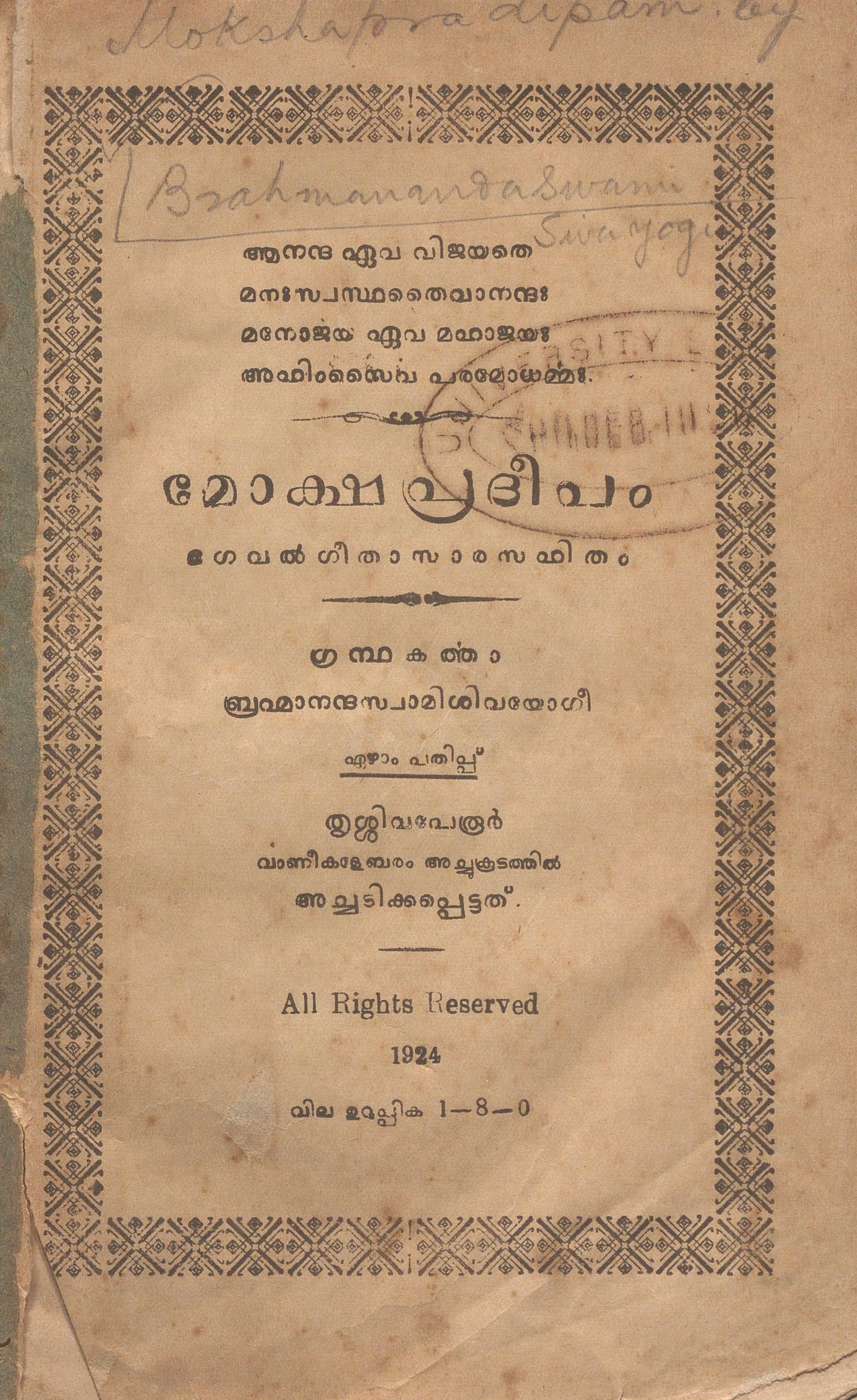 1924 – ൽ പ്രസിദ്ധീകരിച്ച, ബ്രഹ്മാനന്ദസ്വാമി ശിവയോഗി രചിച്ച മോക്ഷപ്രദീപം എന്ന പുസ്തകത്തിൻ്റെ സ്കാൻ ആണ് ഈ പോസ്റ്റിലൂടെ പങ്കു വെക്കുന്നത്.
