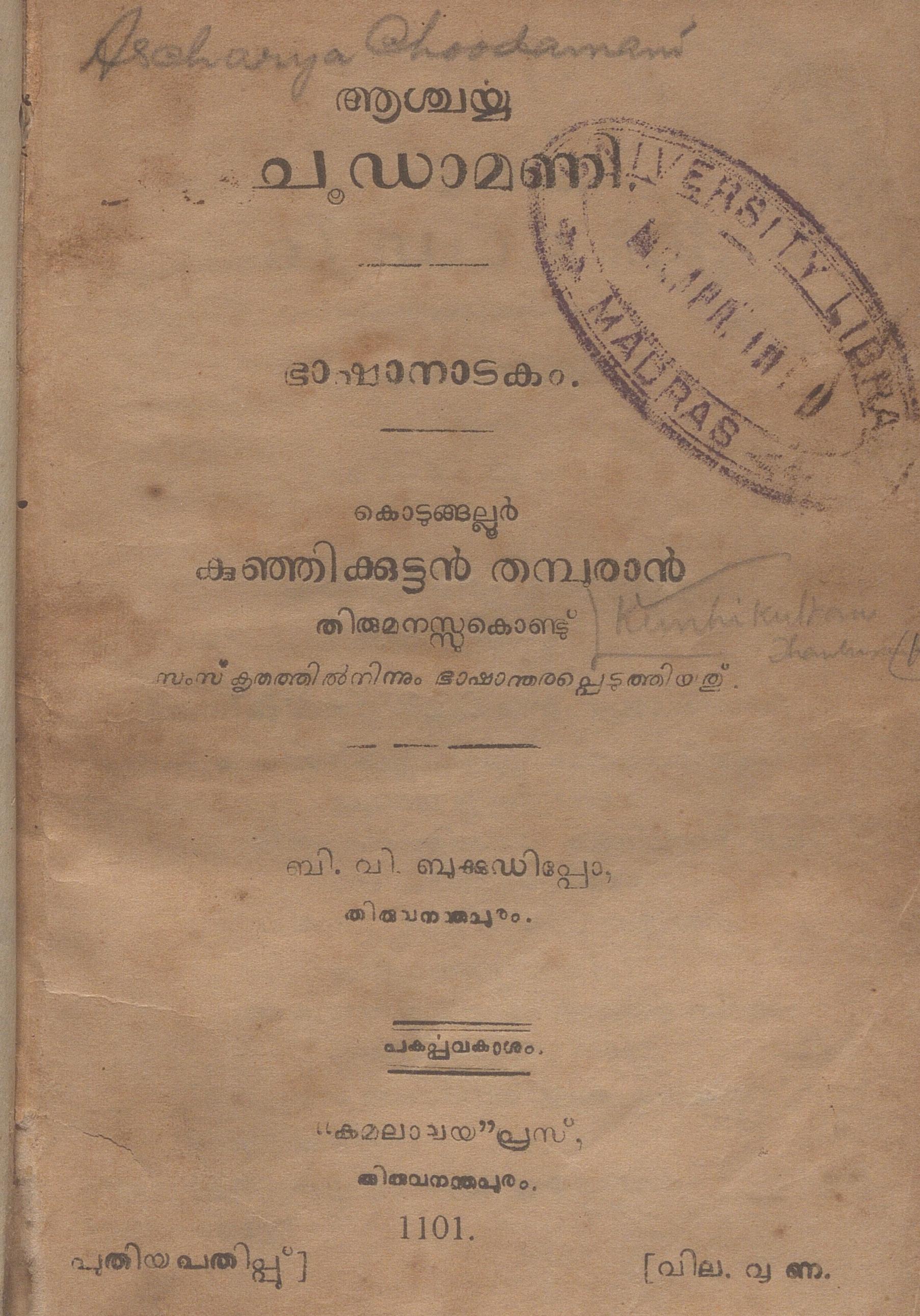 1926-ൽ പ്രസിദ്ധീകരിച്ച, കൊടുങ്ങല്ലൂർ കുഞ്ഞിക്കുട്ടൻ തമ്പുരാൻ വിവർത്തനം ചെയ്ത ആശ്ചര്യ ചൂഡാമണി എന്ന പുസ്തകത്തിൻ്റെ ഡിജിറ്റൽ സ്കാൻ ആണ് ഈ പോസ്റ്റിലൂടെ പങ്കു വെക്കുന്നത്