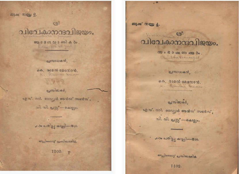 1927- ൽ പ്രസിദ്ധീകരിച്ച, വിവേകാനന്ദവിജയം പുസ്തകം രണ്ട്, നാല് എന്നിവയുടെ ഡിജിറ്റൽ സ്കാൻ ആണ് ഈ പോസ്റ്റിലൂടെ പങ്കു വെക്കുന്നത്