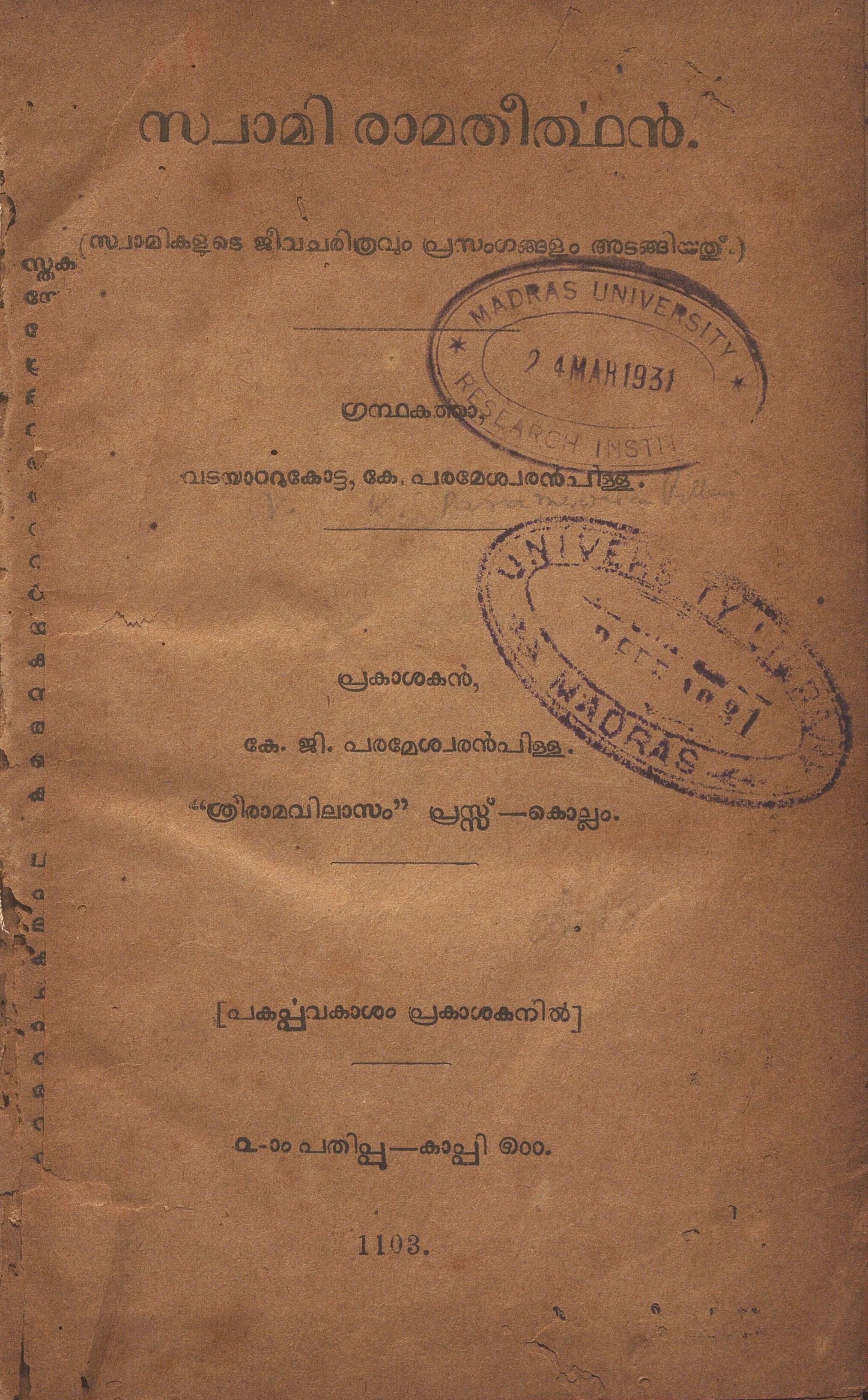 1928-ൽ പ്രസിദ്ധീകരിച്ച, കേ. പരമേശ്വരൻപിള്ള രചിച്ച, സ്വാമി രാമതീർത്ഥൻ എന്ന പുസ്തകത്തിൻ്റെ ഡിജിറ്റൽ സ്കാൻ ആണ് ഈ പോസ്റ്റിലൂടെ പങ്കു വെക്കുന്നത്1928 – സ്വാമി രാമതീർത്ഥൻ