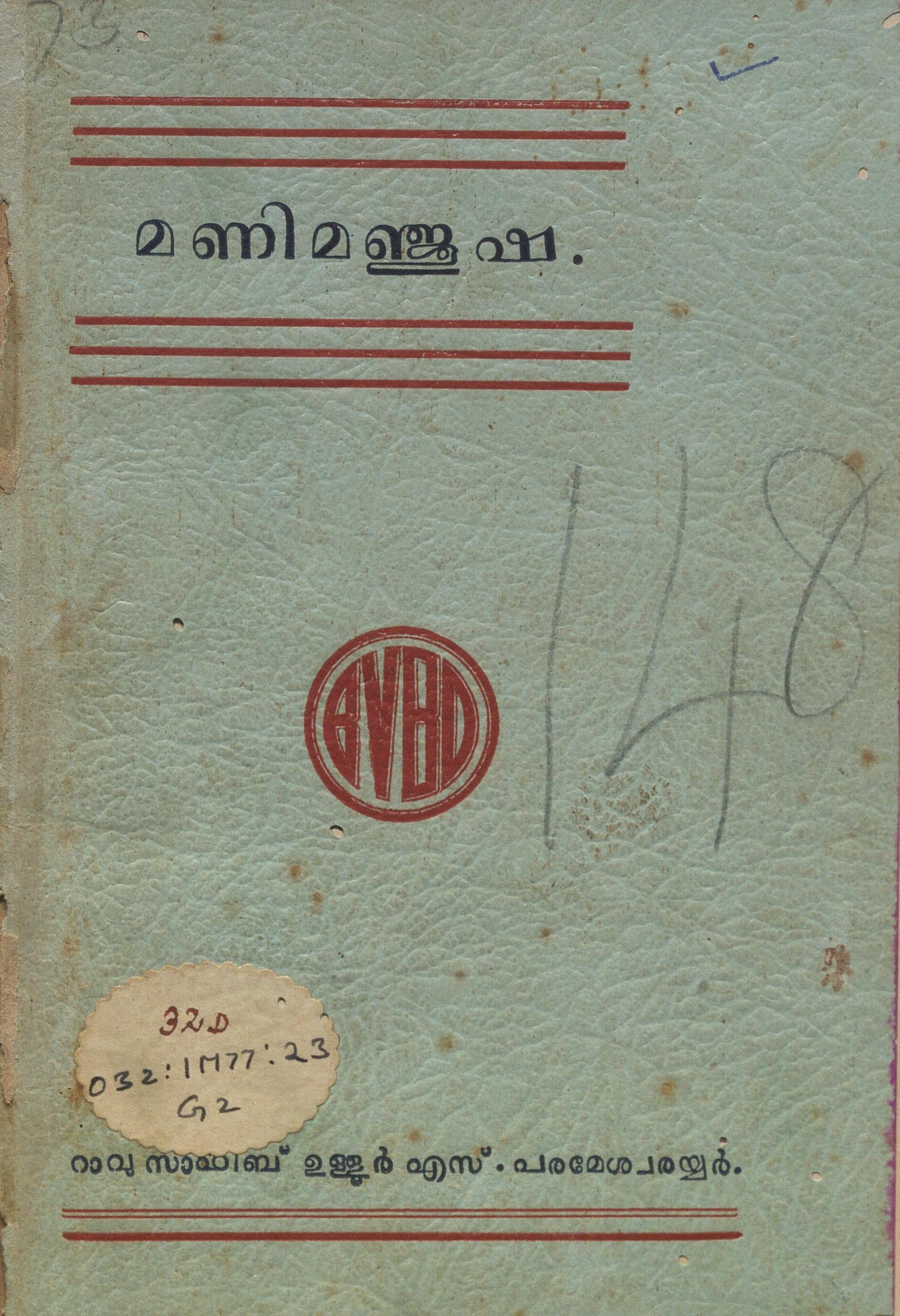 1933-ൽ പ്രസിദ്ധീകരിച്ച, ഉള്ളൂർ എസ്. പരമേശ്വരയ്യർ എഴുതിയ മണിമഞ്ജുഷ എന്ന പുസ്തകത്തിൻ്റെ ഡിജിറ്റൽ സ്കാൻ ആണ് ഈ പോസ്റ്റിലൂടെ പങ്കു വെക്കുന്നത്1933 – മണിമഞ്ജുഷ