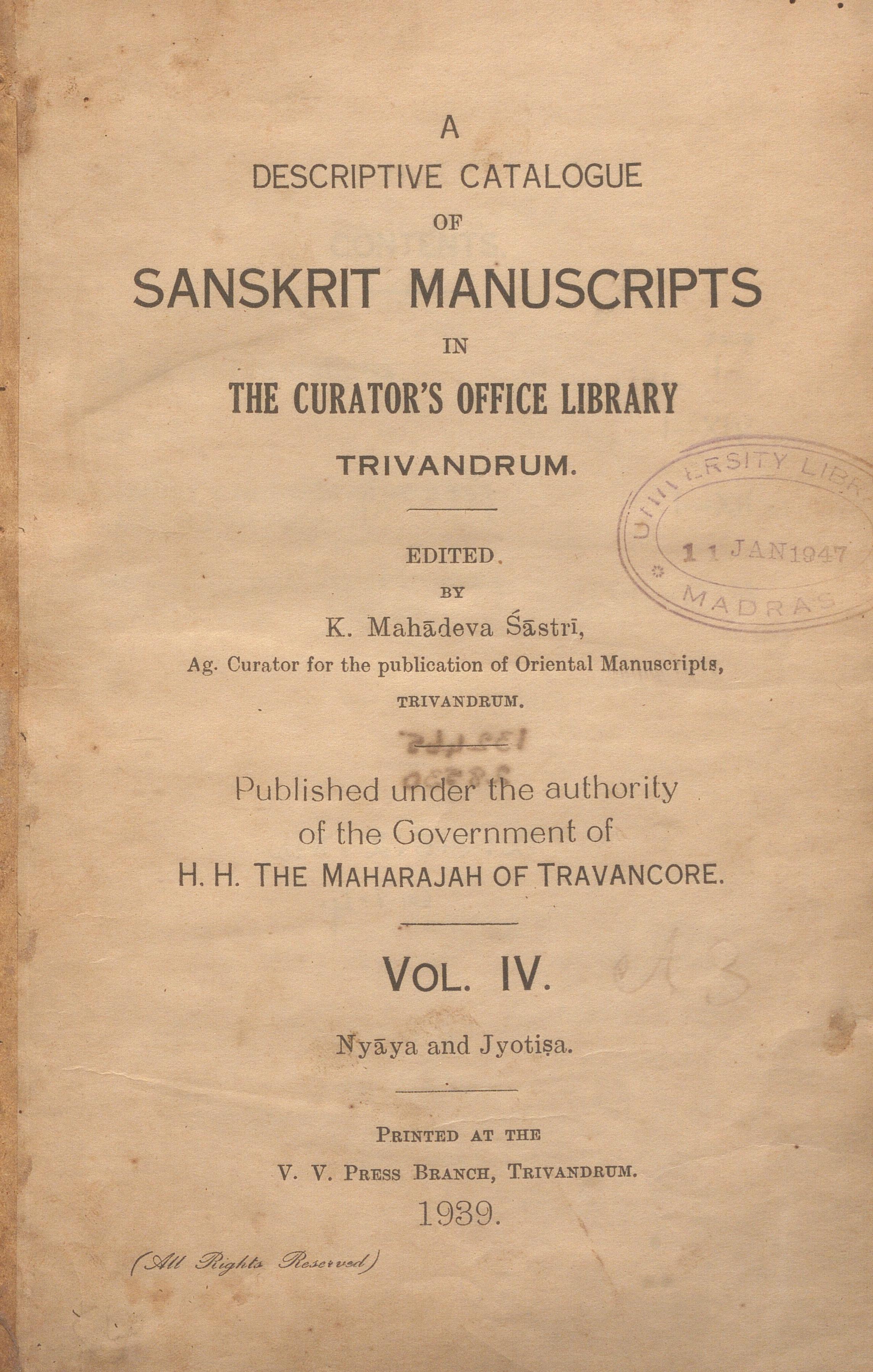 Through this post, we are releasing the digital scan of A Descriptive Catalogue of The Sanskrit Manuscripts In The Curator’s Office Library Trivandrum Vol. IV edited by K. Mahadeva Sastri and published in the year 1939