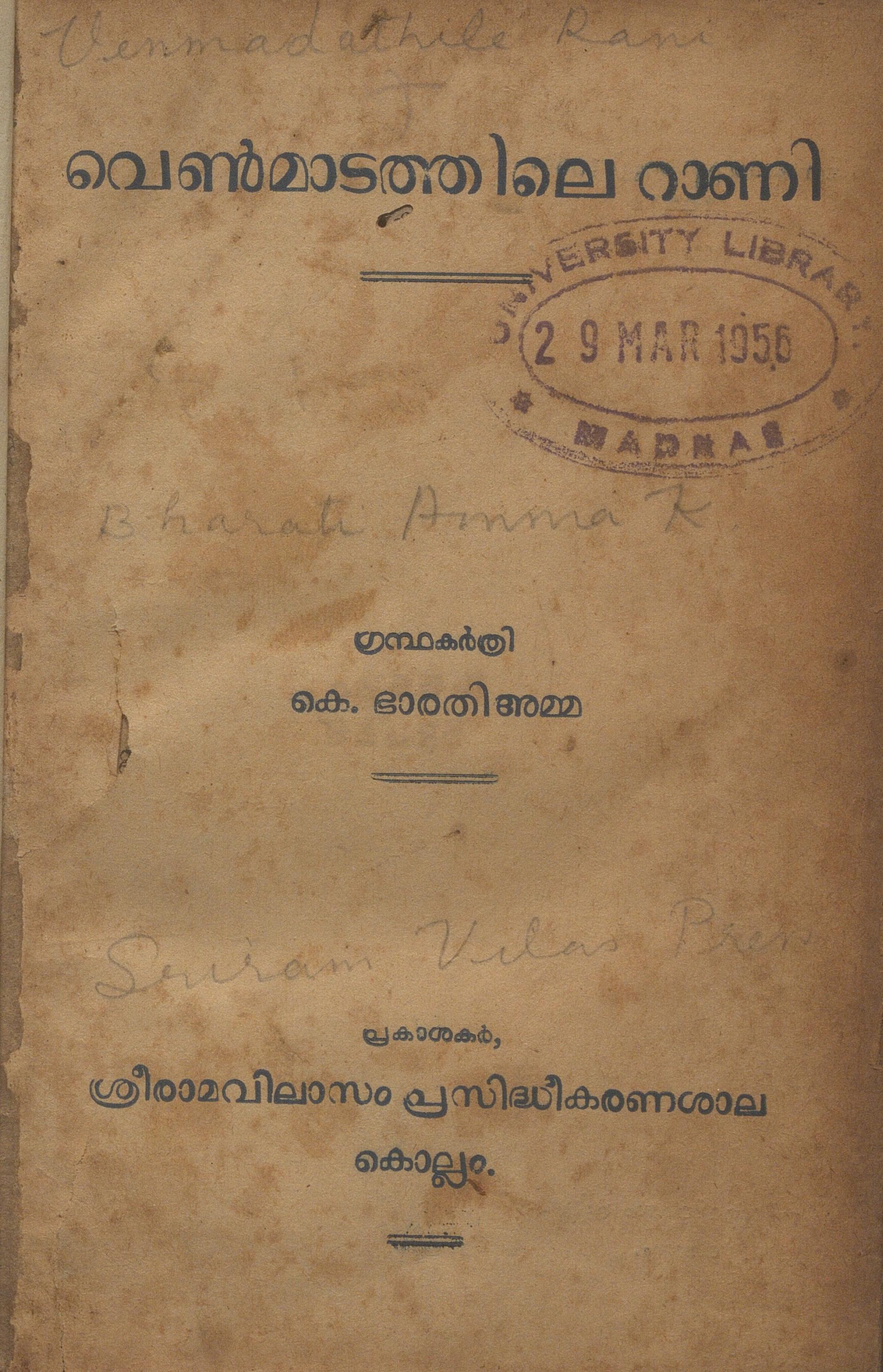 1951-ൽ പ്രസിദ്ധീകരിച്ച, കെ. ഭാരതി അമ്മ എഴുതിയ വെൺമാടത്തിലെ റാണി എന്ന പുസ്തകത്തിൻ്റെ ഡിജിറ്റൽ സ്കാൻ ആണ് ഈ പോസ്റ്റിലൂടെ പങ്കു വെക്കുന്നത്.