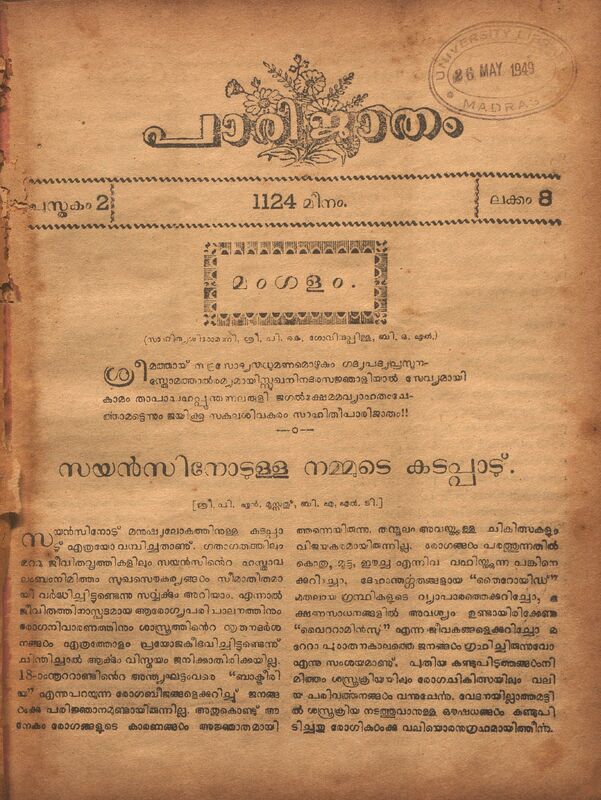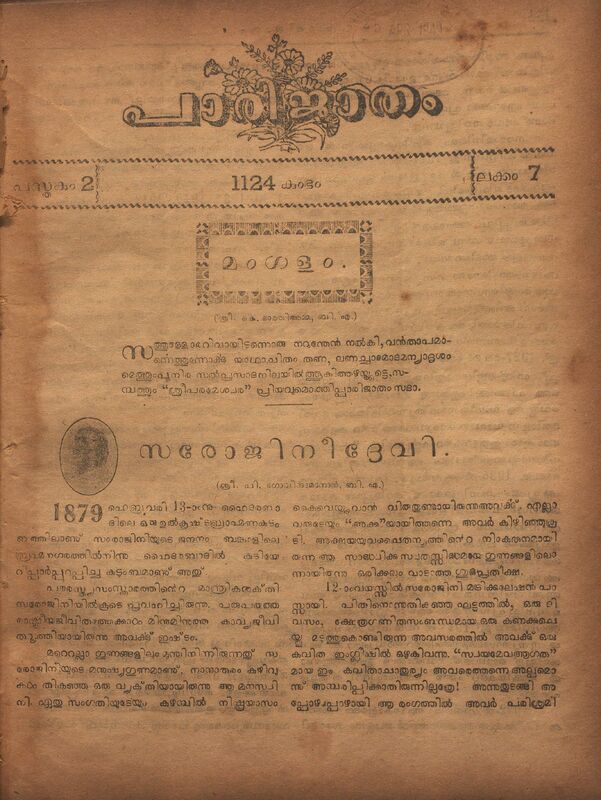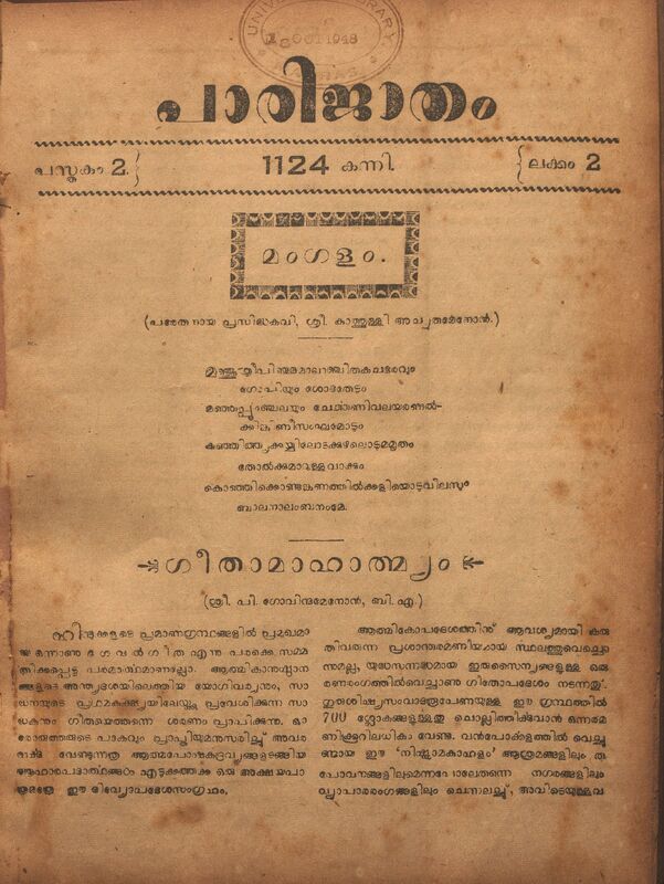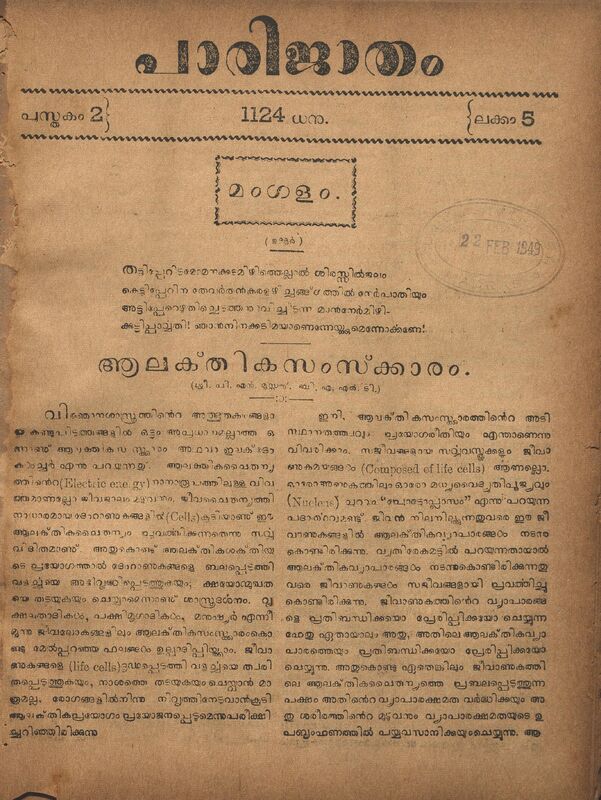 1949 - പാരിജാതം മാസിക - 1124 കുംഭം (1949 ഫെബ്രുവരി) - പുസ്തകം 02 ലക്കം 07