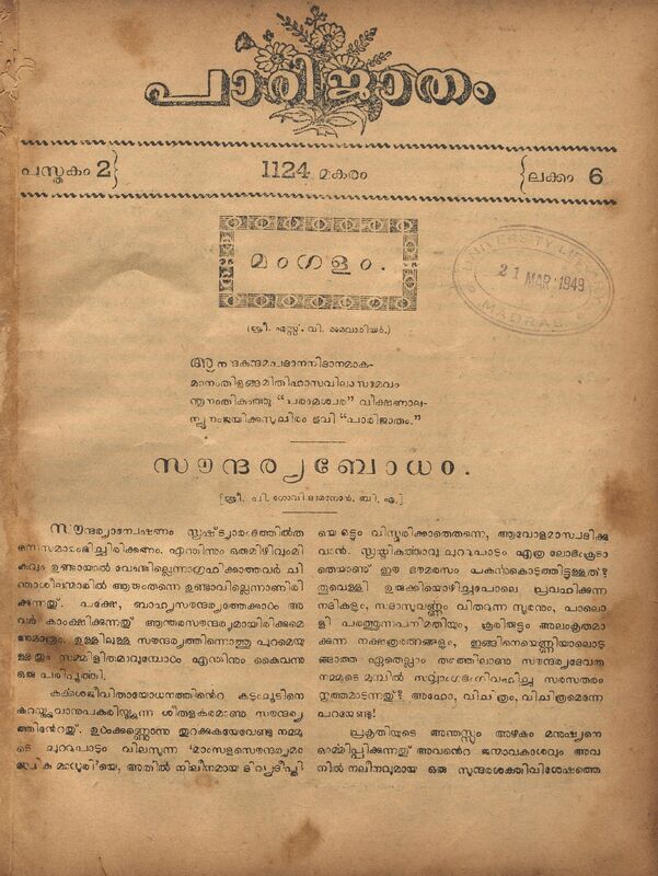1949 - പാരിജാതം മാസിക - 1124 മകരം (1949 ജനുവരി) - പുസ്തകം 02 ലക്കം 06