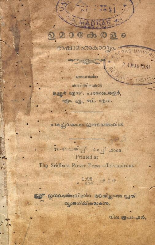 1924 - ഉമാകേരളം ഭാഷാ മഹാകാവ്യം -ഉള്ളൂർ എസ്. പരമേശ്വരയ്യർ
