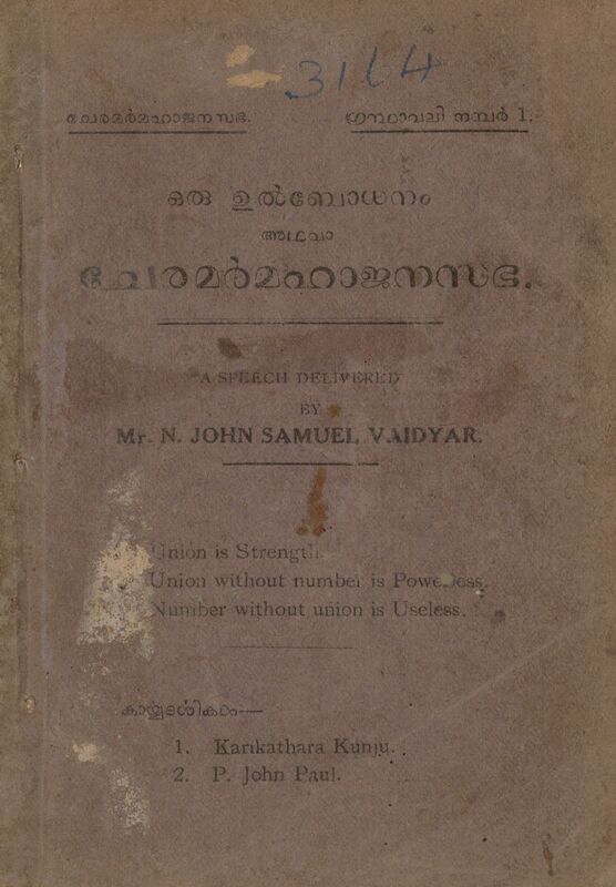 1938 - ഒരു ഉൽബോധനം അഥവാ ചേരമർ മഹാജനസഭ - എൻ. ജോൺ ശാമുവേൽ വൈദ്യർ